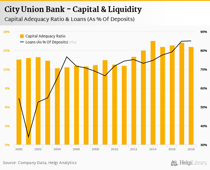 City Union Bank's capital adequacy ratio reached 15.6% at the end of 2018, down from 16.2% compared to the previous year. Historically, the bank’s capital ratio hit an all time high of 16.5% in 2014 and an all time low of 12.2% in 2004.