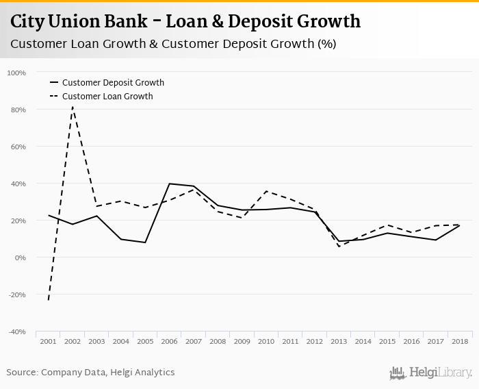 City Union Bank's customer loan growth reached 17.3% in 2018, up from 16.9% compared to the previous year. Historically, the bank’s loans growth reached an all time high of 81.2% in 2002 and an all time low of -23.5% in 2001. In the last decade, the average annual loan growth amounted to 19.2%.