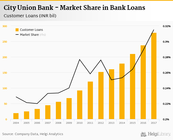 City Union Bank's customer loans reached INR 279 bil in 2017, up 16.9% compared to the previous year.