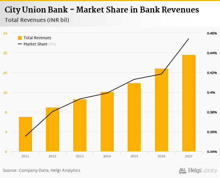 As a result, City Union Bank accounted for 0.454% of all bank revenues generated by banks in India in 2017. Historically, the bank’s market share in total revenues reached an all time high of 0.454% in 2017 and an all time low of 0.355% in 2011.