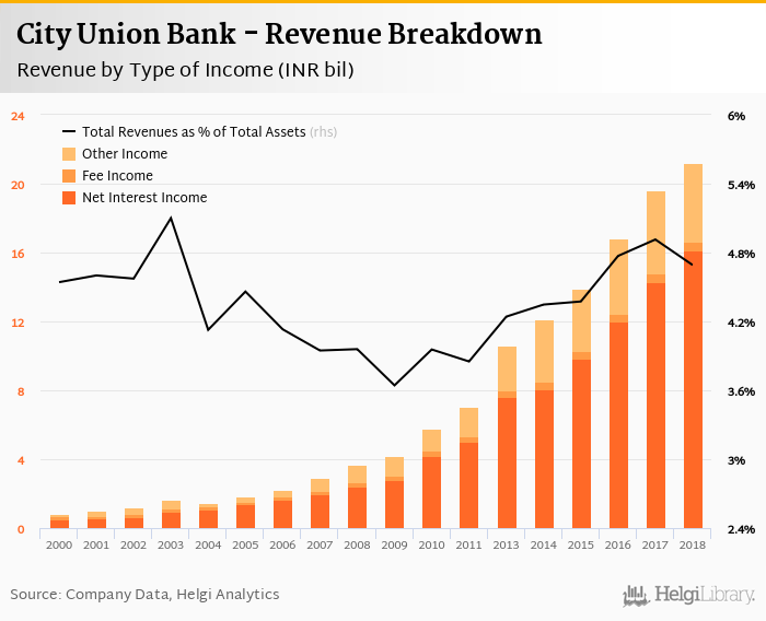 City Union Bank generated total banking revenues of INR 21.2 bil in 2018, up 8.19% compared to the previous year.