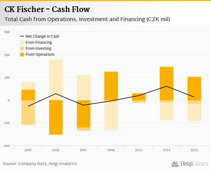 Cash from financing amounted to CZK -74.3 mil, so the company generated CZK 12.7 mil net cash in 2015.