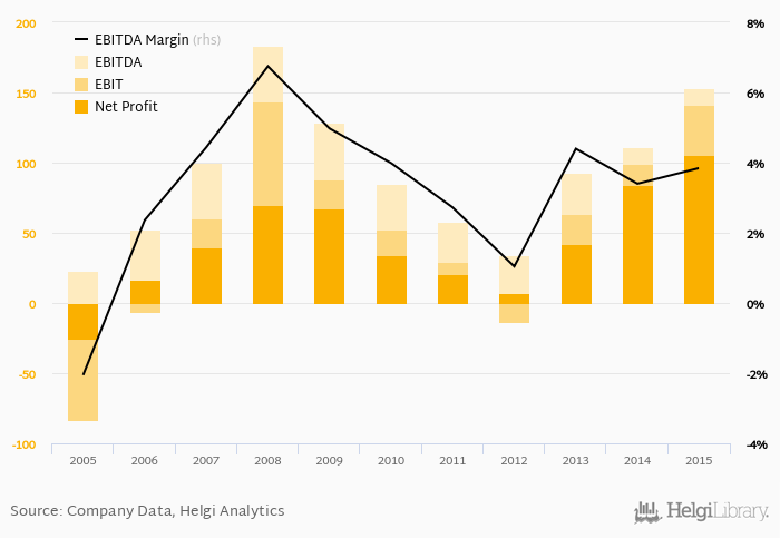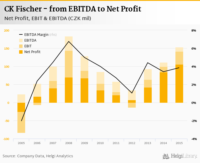 CK Fischer made a net profit of CZK 106 mil with revenues of CZK 3,986 mil in 2015, up by 25.3% and up by 21.8%, respectively, compared to the previous year. This translates into a net margin of 2.65%.