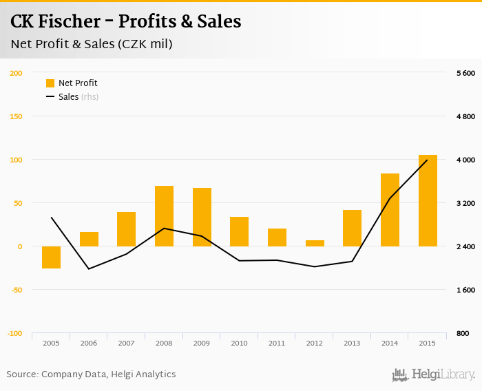 CK Fischer made a net profit of CZK 106 mil in 2015, up 25.3% compared to the previous year. Total sales reached CZK 3,986 mil, which is up 21.8% when compared to the previous year.