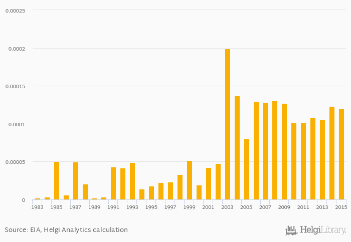 Historically, coal consumption as a share of worldwide consumption in Dominican Republic reached an all time high of < 0.001% in 2003 and an all time low of < 0.001% in 1983. When compared to Dominican Republic's main peers, coal consumption as a share of worldwide consumption in Cuba amounted to < 0.001%, < 0.001% in Jamaica, 0.003% in Mexico and 0.094% in USA in 2015.