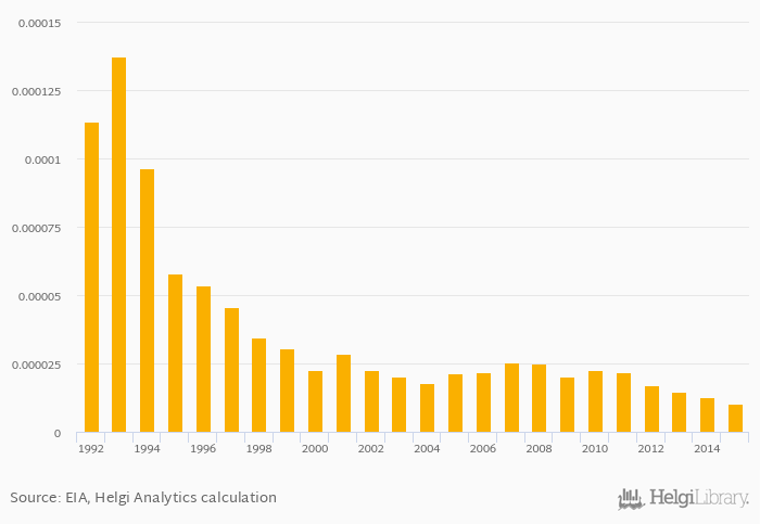 Coal consumption as a share of worldwide consumption fell 17.7% to < 0.001% in Latvia in 2015, according to the National Statistical Office.
