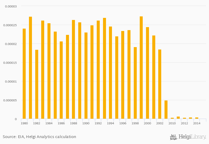 Historically, coal consumption as a share of worldwide consumption in Tunisia reached an all time high of < 0.001% in 1999 and an all time low of < 0.001% in 2015.
