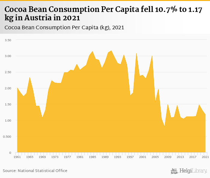 Cocoa bean consumption per capita fell 10.7% to 1.17 kg in Austria in 2021, according to Faostat.