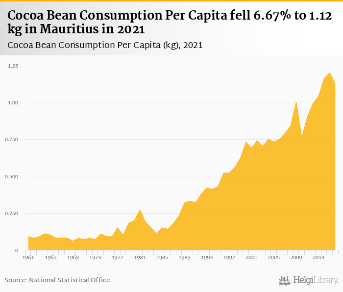 Cocoa bean consumption per capita fell 6.67% to 1.12 kg in Mauritius in 2021, according to Faostat.