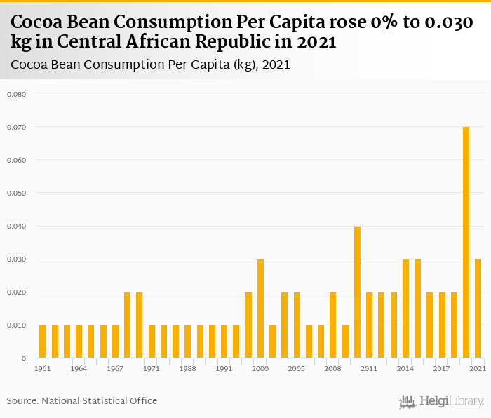 Cocoa bean consumption per capita rose 0% to 0.030 kg in Central African Republic in 2021, according to Faostat.