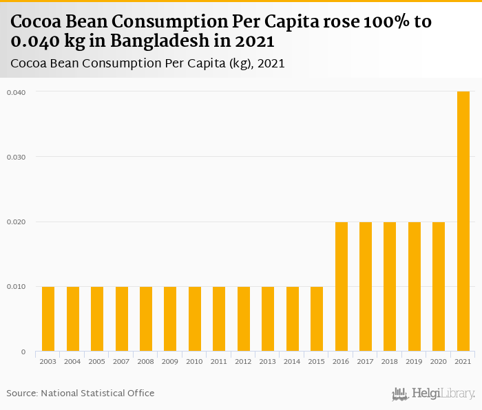 Cocoa bean consumption per capita rose 100% to 0.040 kg in Bangladesh in 2021, according to Faostat.