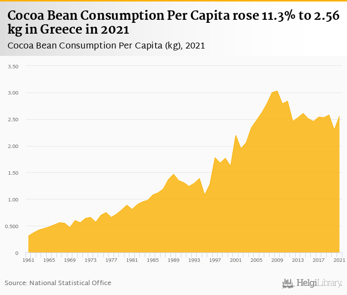 Cocoa bean consumption per capita rose 11.3% to 2.56 kg in Greece in 2021, according to Faostat.