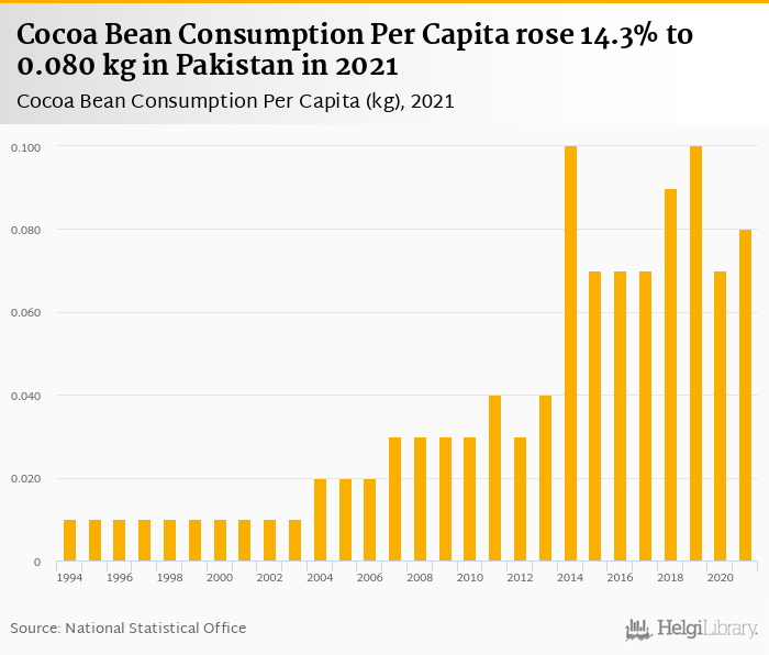 Cocoa bean consumption per capita rose 14.3% to 0.080 kg in Pakistan in 2021, according to Faostat.