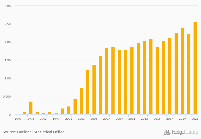 Historically, cocoa bean consumption per capita in Georgia reached an all time high of 2.56 kg in 2021 and an all time low of 0.020 kg in 1993. When compared to Georgia's main peers, cocoa bean consumption per capita in Armenia amounted to 2.38 kg, 1.47 kg in Azerbaijan, 1.02 kg in Russia and 1.01 kg in Turkey in 2021.