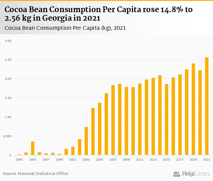 Cocoa bean consumption per capita rose 14.8% to 2.56 kg in Georgia in 2021, according to Faostat.