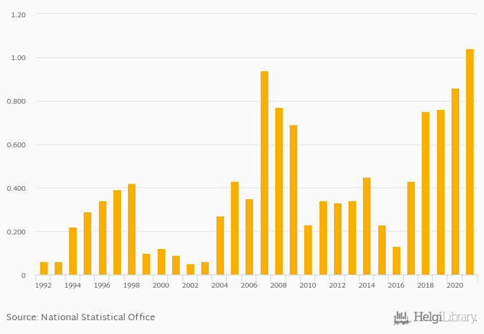 Historically, cocoa bean consumption per capita in Ukraine reached an all time high of 1.04 kg in 2021 and an all time low of 0.050 kg in 2002. When compared to Ukraine's main peers, cocoa bean consumption per capita in Poland amounted to 0.560 kg, 2.08 kg in Romania and 1.02 kg in Russia in 2021.