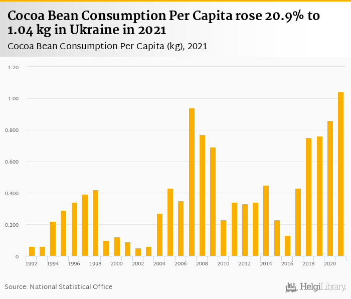 Cocoa bean consumption per capita rose 20.9% to 1.04 kg in Ukraine in 2021, according to Faostat.