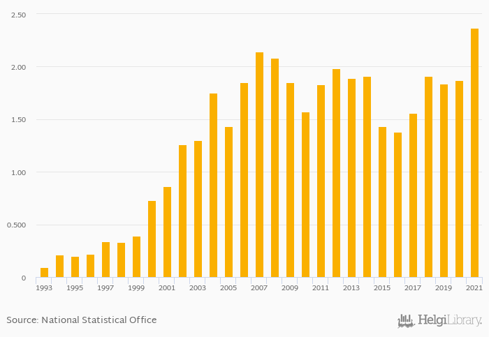 Historically, cocoa bean consumption per capita in Kazakhstan reached an all time high of 2.37 kg in 2021 and an all time low of 0.090 kg in 1993. When compared to Kazakhstan's main peers, cocoa bean consumption per capita in China amounted to 0.130 kg, 1.24 kg in Kyrgyzstan, 1.02 kg in Russia and 0.800 kg in Uzbekistan in 2021.