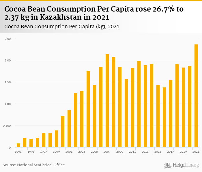 Cocoa bean consumption per capita rose 26.7% to 2.37 kg in Kazakhstan in 2021, according to Faostat.