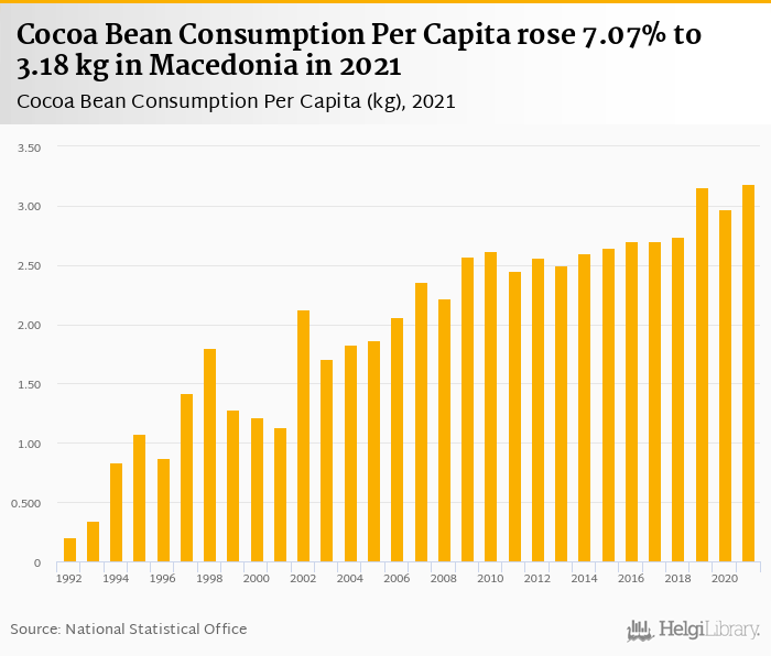 Cocoa bean consumption per capita rose 7.07% to 3.18 kg in Macedonia in 2021, according to Faostat.