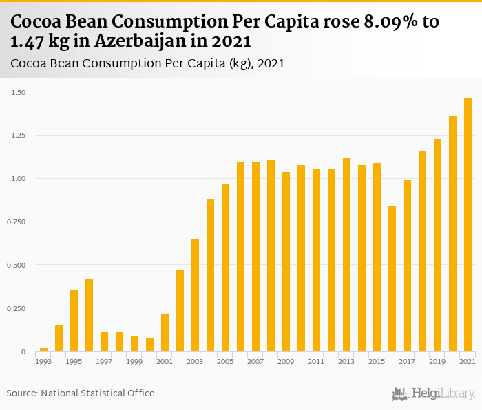 Cocoa bean consumption per capita rose 8.09% to 1.47 kg in Azerbaijan in 2021, according to Faostat.