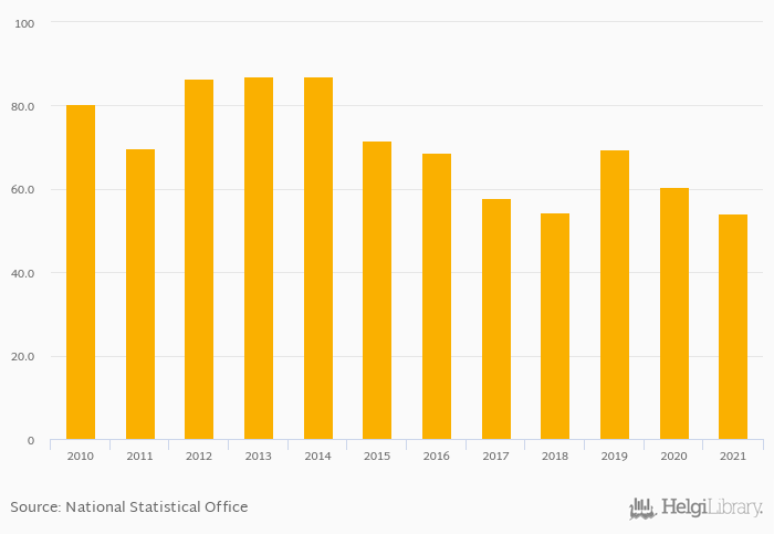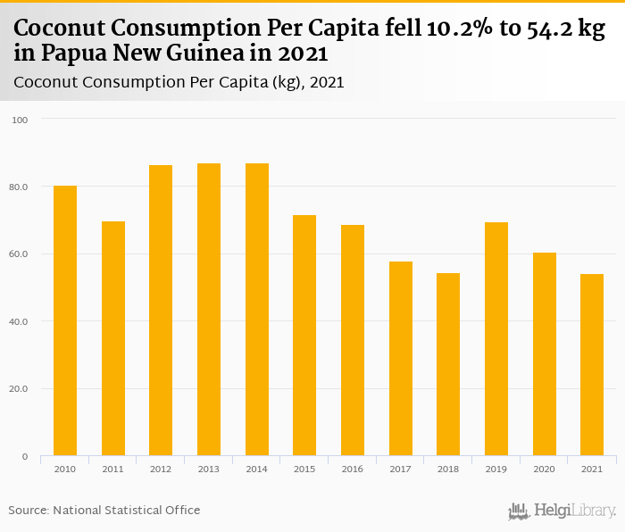 Coconut consumption per capita fell 10.2% to 54.2 kg in Papua New Guinea in 2021, according to Faostat.