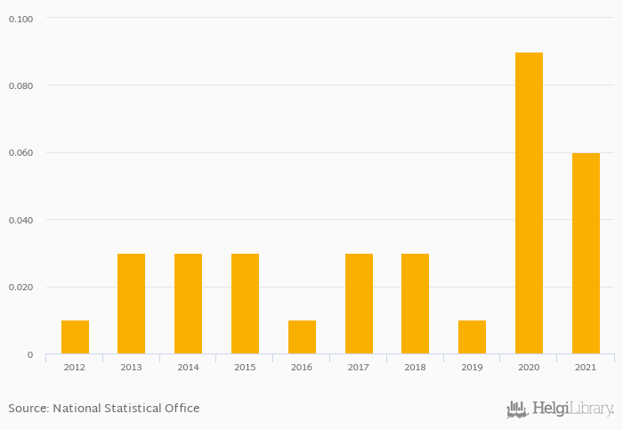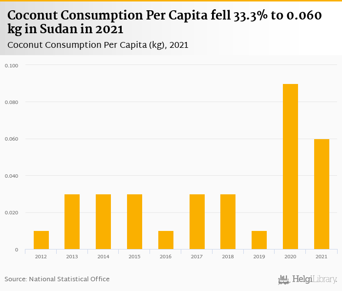 Coconut consumption per capita fell 33.3% to 0.060 kg in Sudan in 2021, according to Faostat.