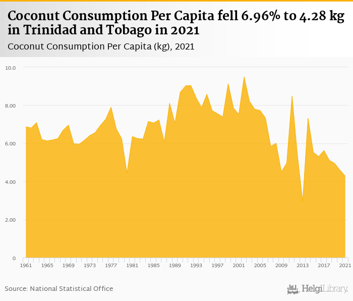 Historically, coconut consumption per capita in Trinidad and Tobago reached an all time high of 9.49 kg in 2002 and an all time low of 2.95 kg in 2013.