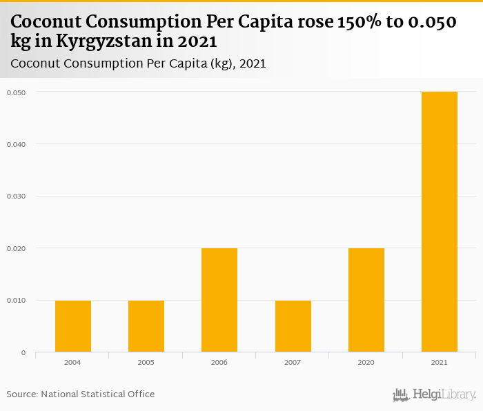 Coconut consumption per capita rose 150% to 0.050 kg in Kyrgyzstan in 2021, according to Faostat.