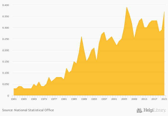 Historically, coconut consumption per capita in Italy reached an all time high of 0.390 kg in 2006 and an all time low of 0.030 kg in 1961. When compared to Italy's main peers, coconut consumption per capita in Austria amounted to 0.840 kg, 0.600 kg in France, 0.490 kg in Slovenia and 0.690 kg in Switzerland in 2021.