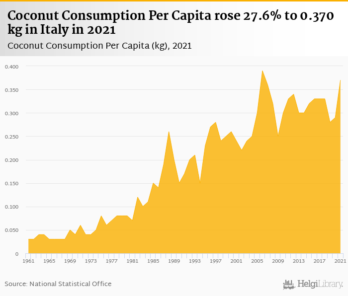 Coconut consumption per capita rose 27.6% to 0.370 kg in Italy in 2021, according to Faostat.