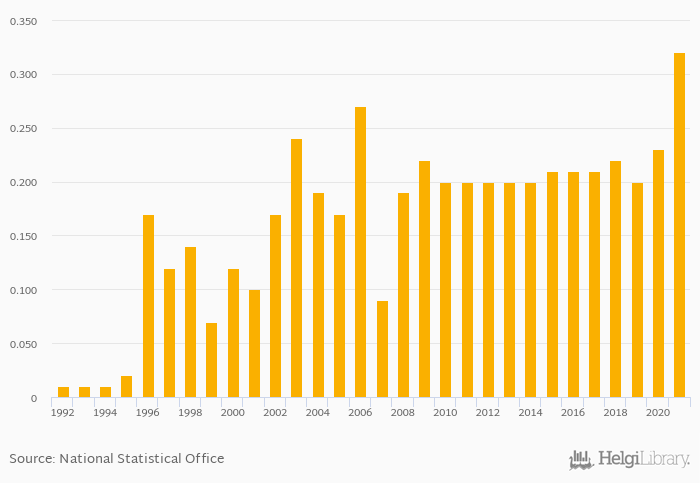 Historically, coconut consumption per capita in Romania reached an all time high of 0.320 kg in 2021 and an all time low of 0.010 kg in 1992.