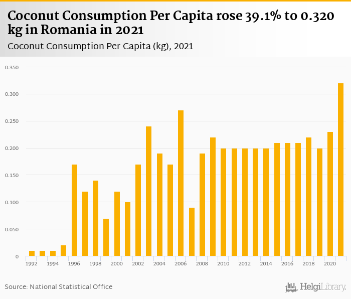 Coconut consumption per capita rose 39.1% to 0.320 kg in Romania in 2021, according to Faostat.