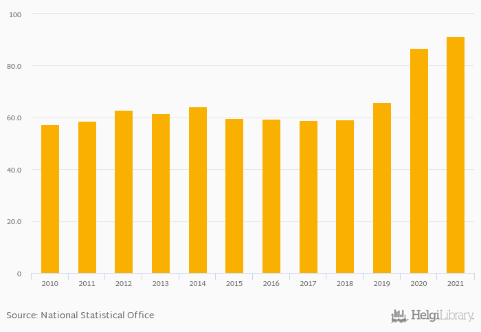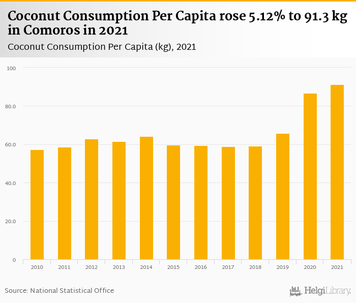 Coconut consumption per capita rose 5.12% to 91.3 kg in Comoros in 2021, according to Faostat.