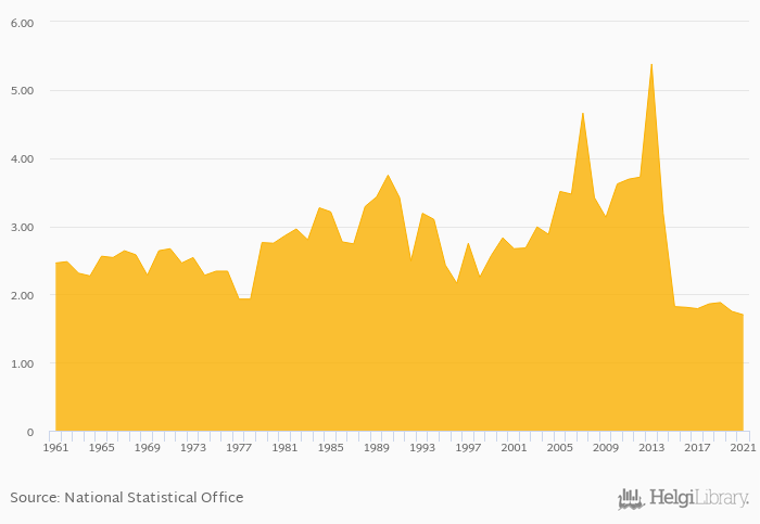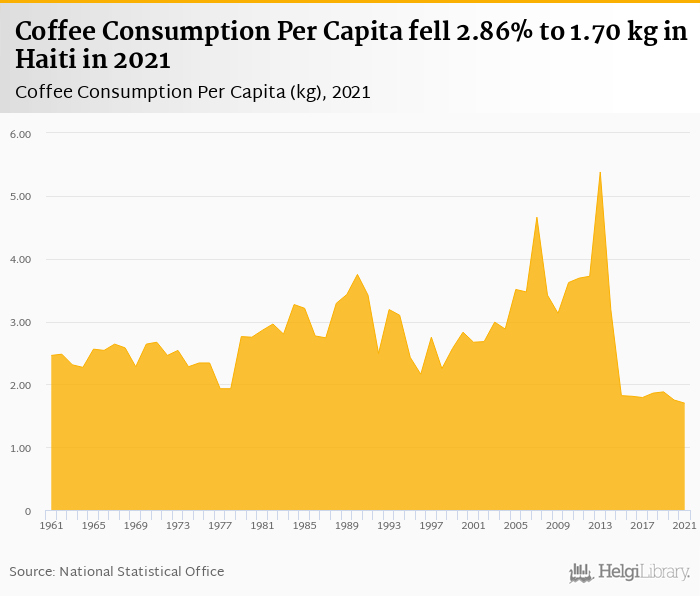 Coffee consumption per capita fell 2.86% to 1.70 kg in Haiti in 2021, according to Faostat.