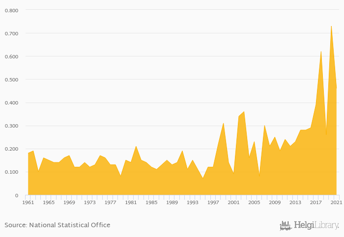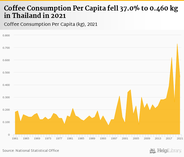 Coffee consumption per capita fell 37.0% to 0.460 kg in Thailand in 2021, according to Faostat.