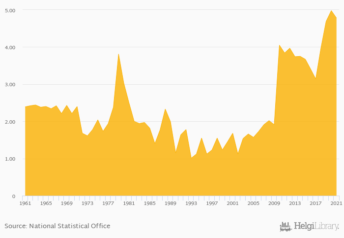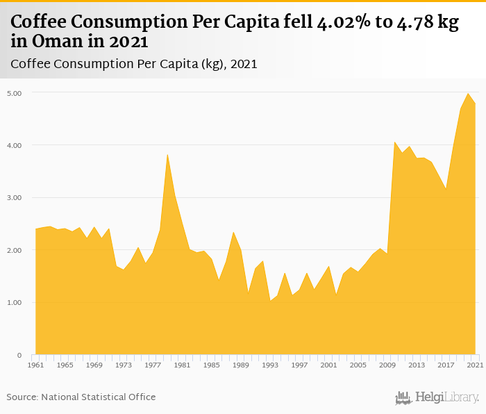 Coffee consumption per capita fell 4.02% to 4.78 kg in Oman in 2021, according to Faostat.