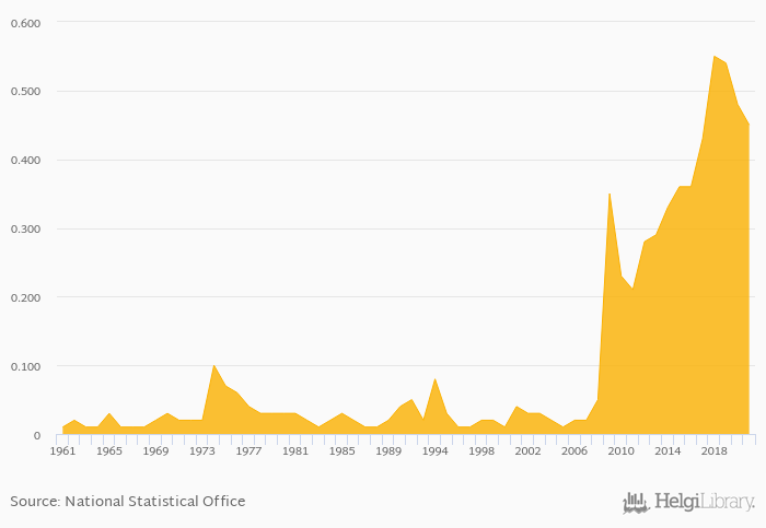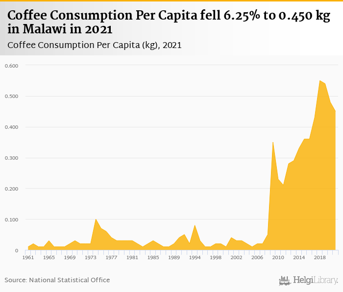 Coffee consumption per capita fell 6.25% to 0.450 kg in Malawi in 2021, according to Faostat.