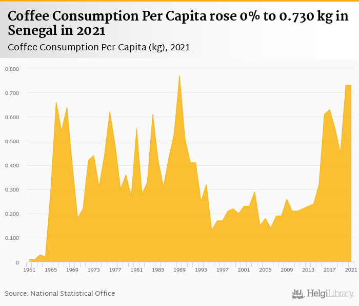 Coffee consumption per capita rose 0% to 0.730 kg in Senegal in 2021, according to Faostat.