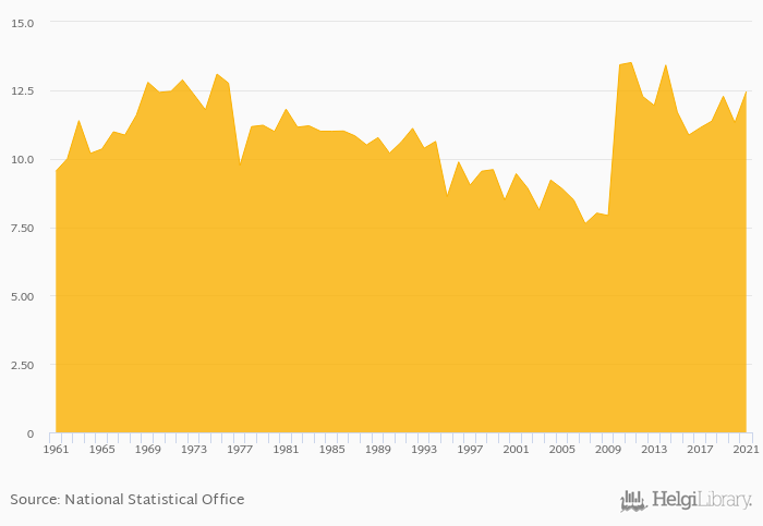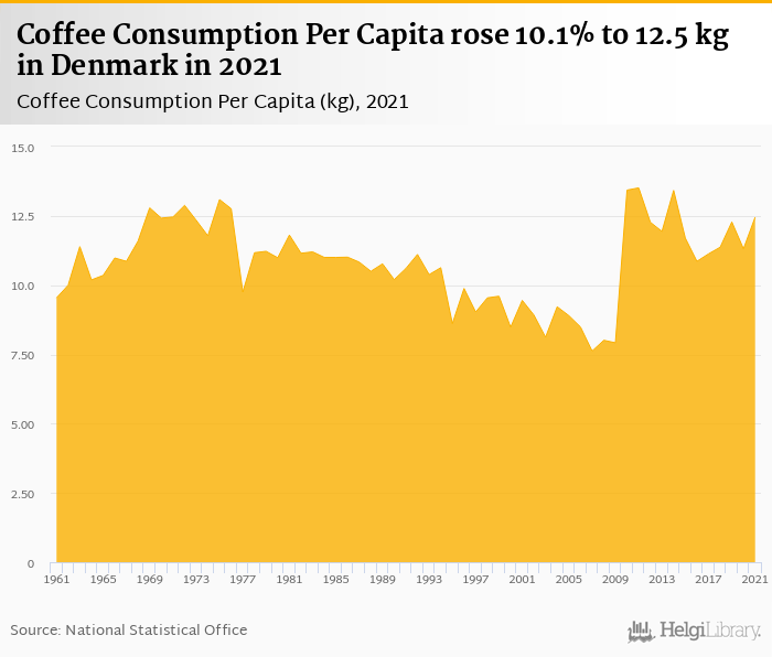 Coffee consumption per capita rose 10.1% to 12.5 kg in Denmark in 2021, according to Faostat.