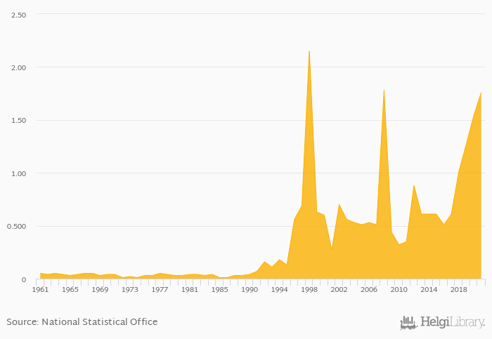 Historically, coffee consumption per capita in Togo reached an all time high of 2.15 kg in 1998 and an all time low of 0.010 kg in 1985. When compared to Togo's main peers, coffee consumption per capita in Benin amounted to 0.450 kg, 0.370 kg in Burkina Faso, 0.010 kg in Ghana and 0.040 kg in Nigeria in 2021.