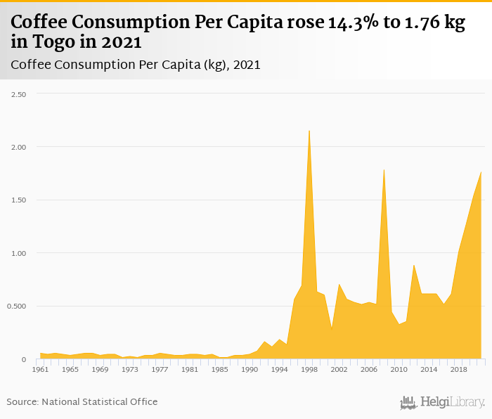 Coffee consumption per capita rose 14.3% to 1.76 kg in Togo in 2021, according to Faostat.