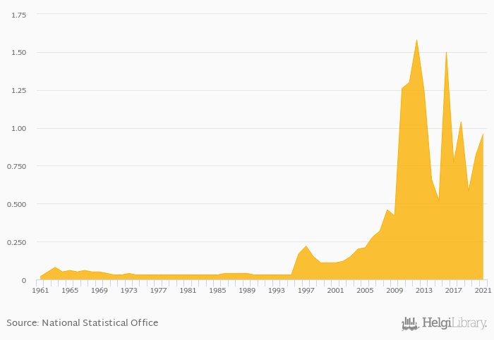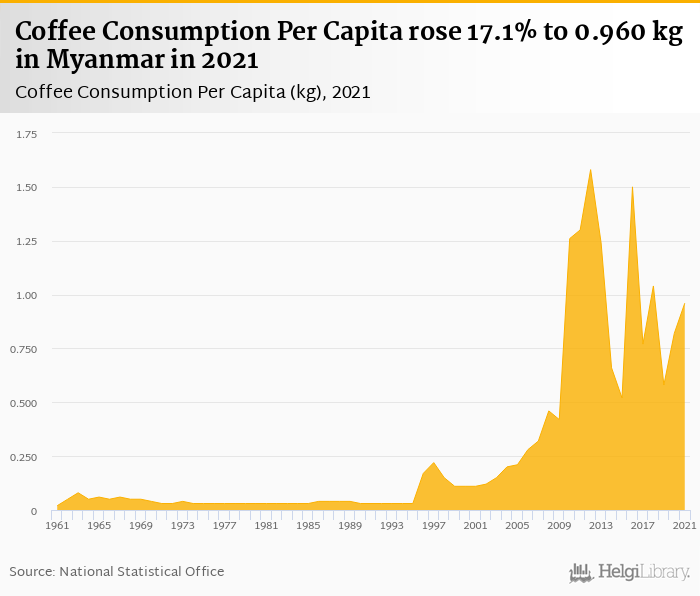 Coffee consumption per capita rose 17.1% to 0.960 kg in Myanmar in 2021, according to Faostat.