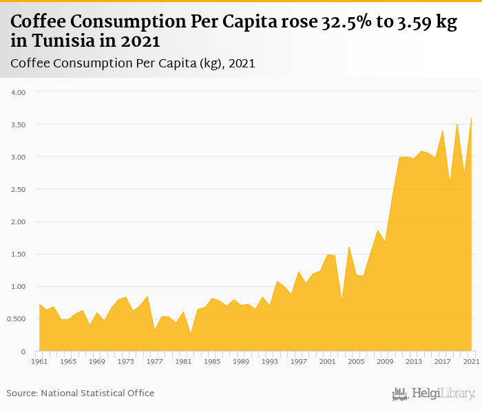 Coffee consumption per capita rose 32.5% to 3.59 kg in Tunisia in 2021, according to Faostat.