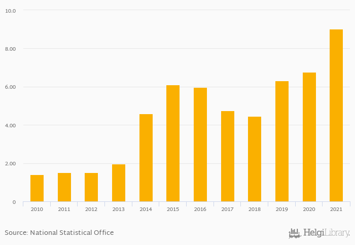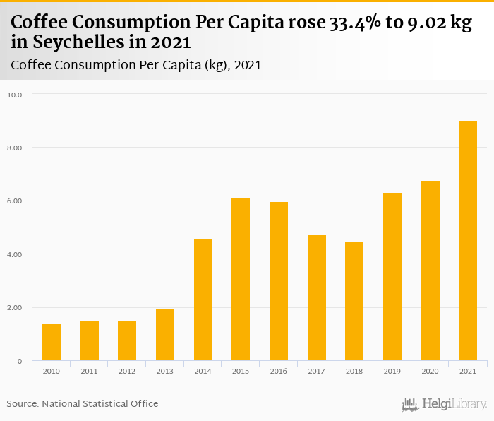 Coffee consumption per capita rose 33.4% to 9.02 kg in Seychelles in 2021, according to Faostat.