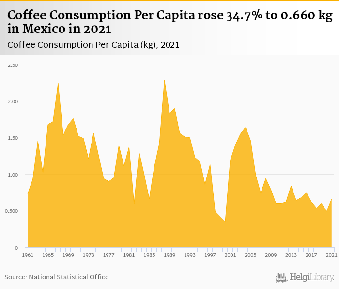 Coffee consumption per capita rose 34.7% to 0.660 kg in Mexico in 2021, according to Faostat.
