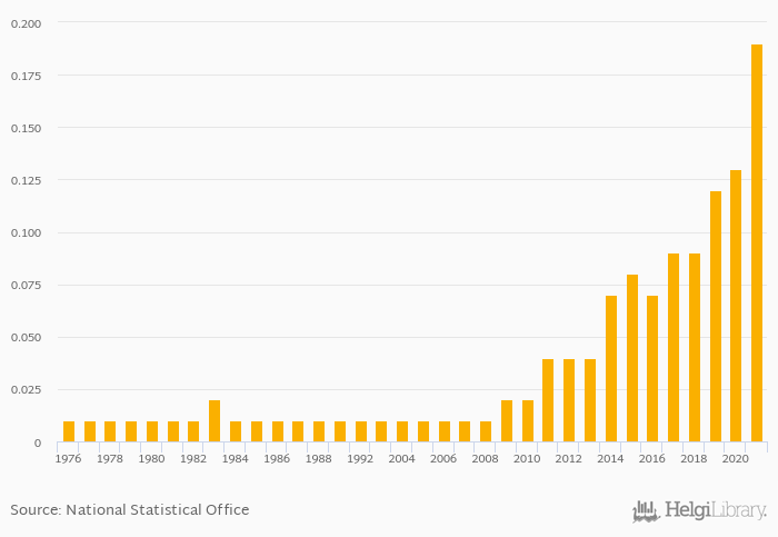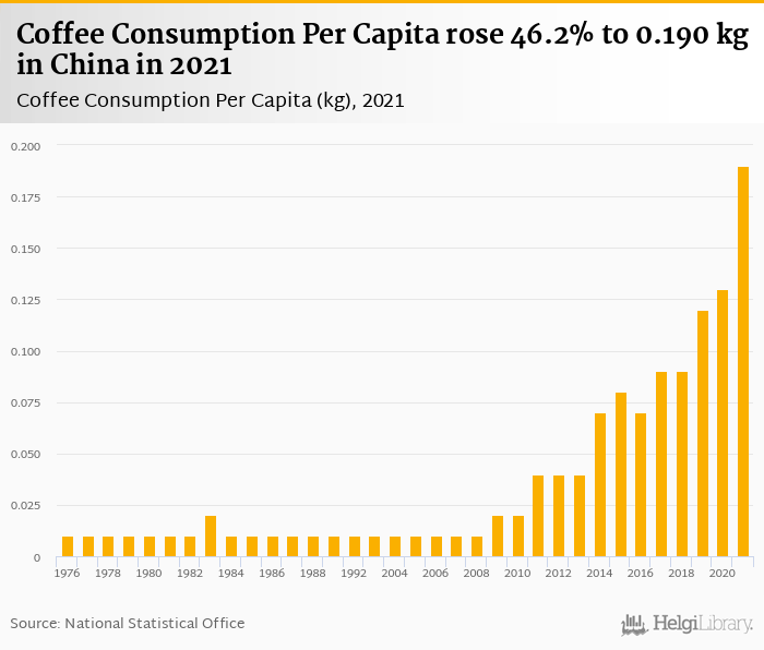 Coffee consumption per capita rose 46.2% to 0.190 kg in China in 2021, according to Faostat.