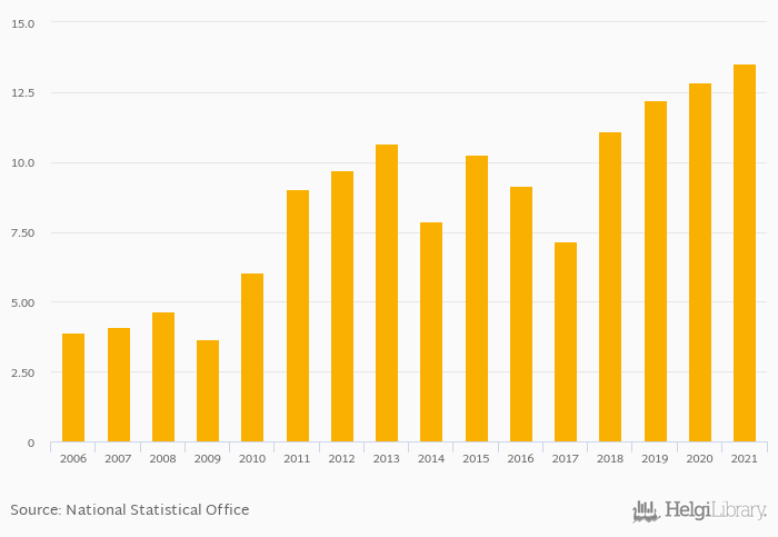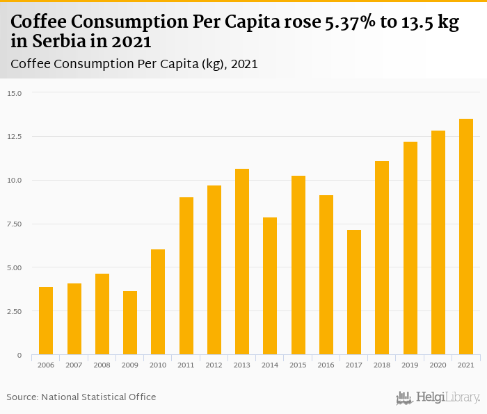 Coffee consumption per capita rose 5.37% to 13.5 kg in Serbia in 2021, according to Faostat.