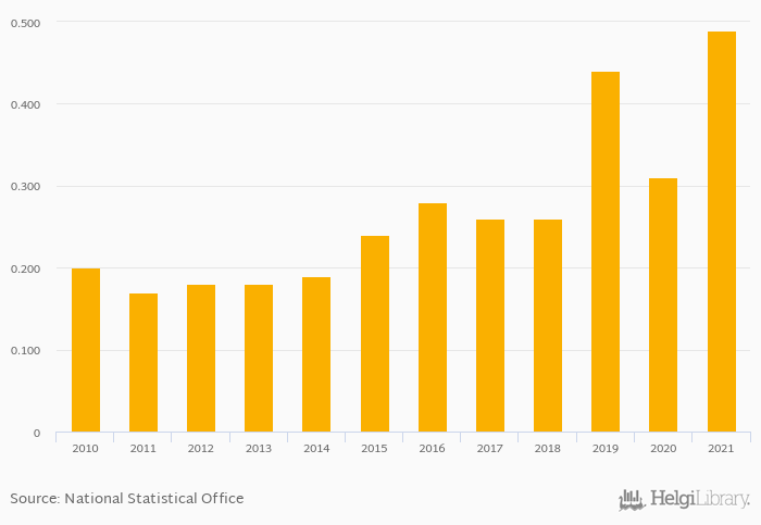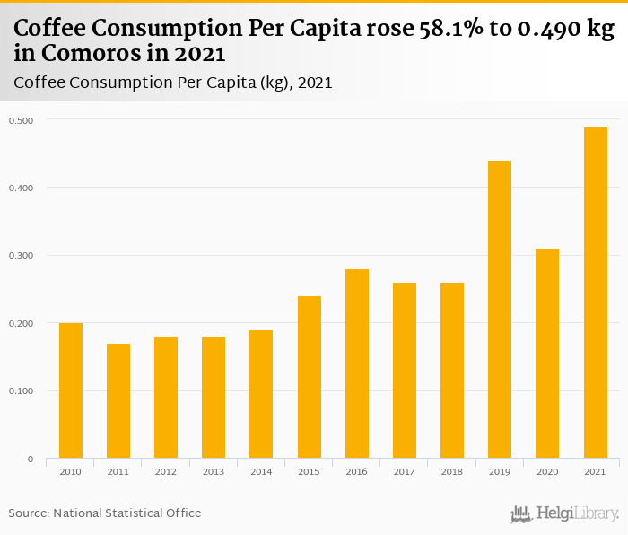 Coffee consumption per capita rose 58.1% to 0.490 kg in Comoros in 2021, according to Faostat.