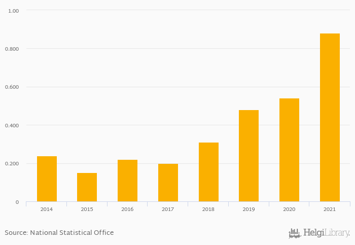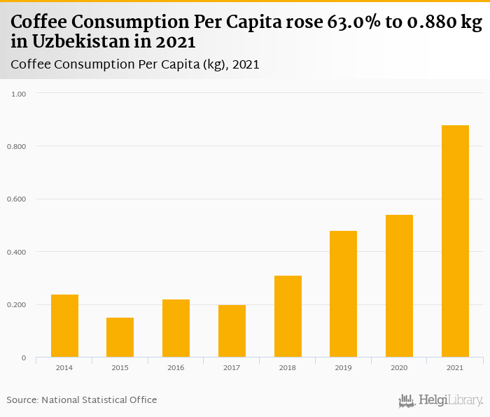 Coffee consumption per capita rose 63.0% to 0.880 kg in Uzbekistan in 2021, according to Faostat.